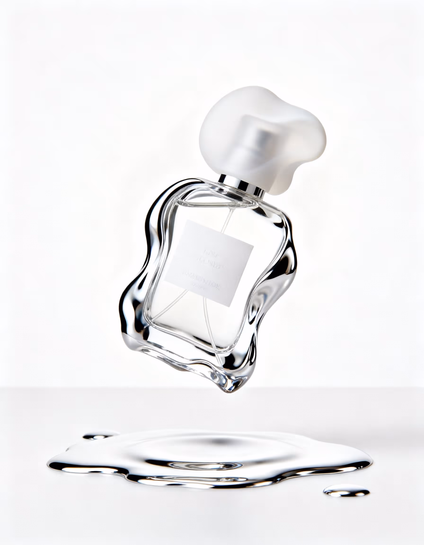 Perfume bottle, high-end with soft curves and abstract shape, appears to be melting into a pool of mercury, studio product photography, white background, floating in zero gravity.