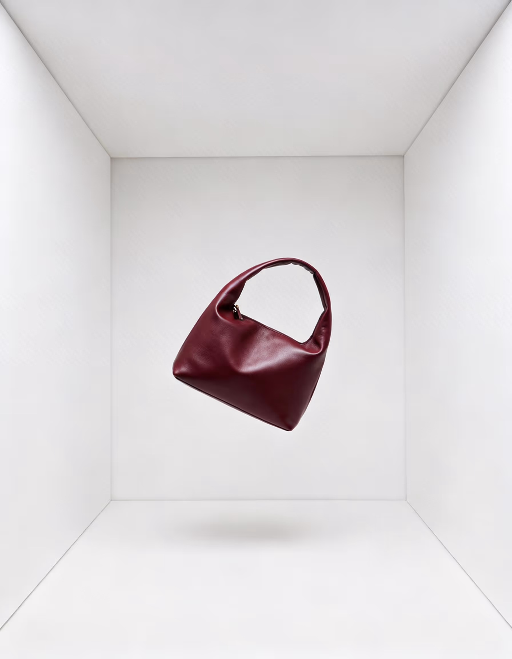 Wine coloured bag, floating in zero gravity inside a white cube room, abstract fashion concept.