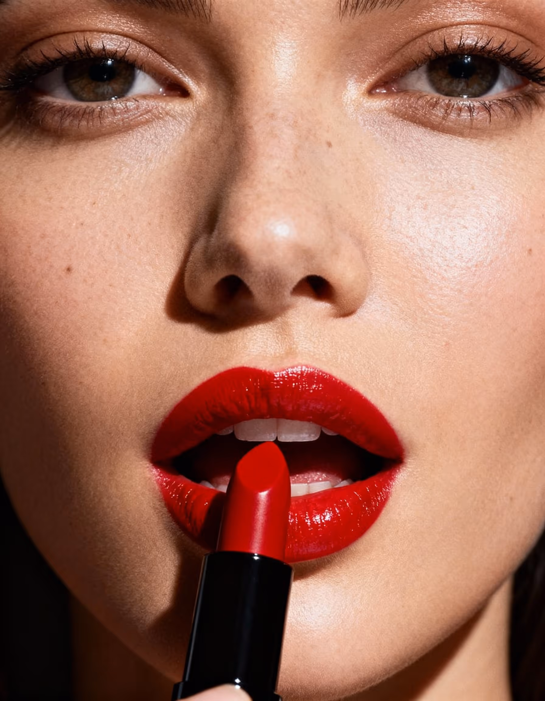 Close up shot of a young woman in late 20's applying red lipstick. Mouth is slightly ajar, and lipstick applied, lipsick on lips.
