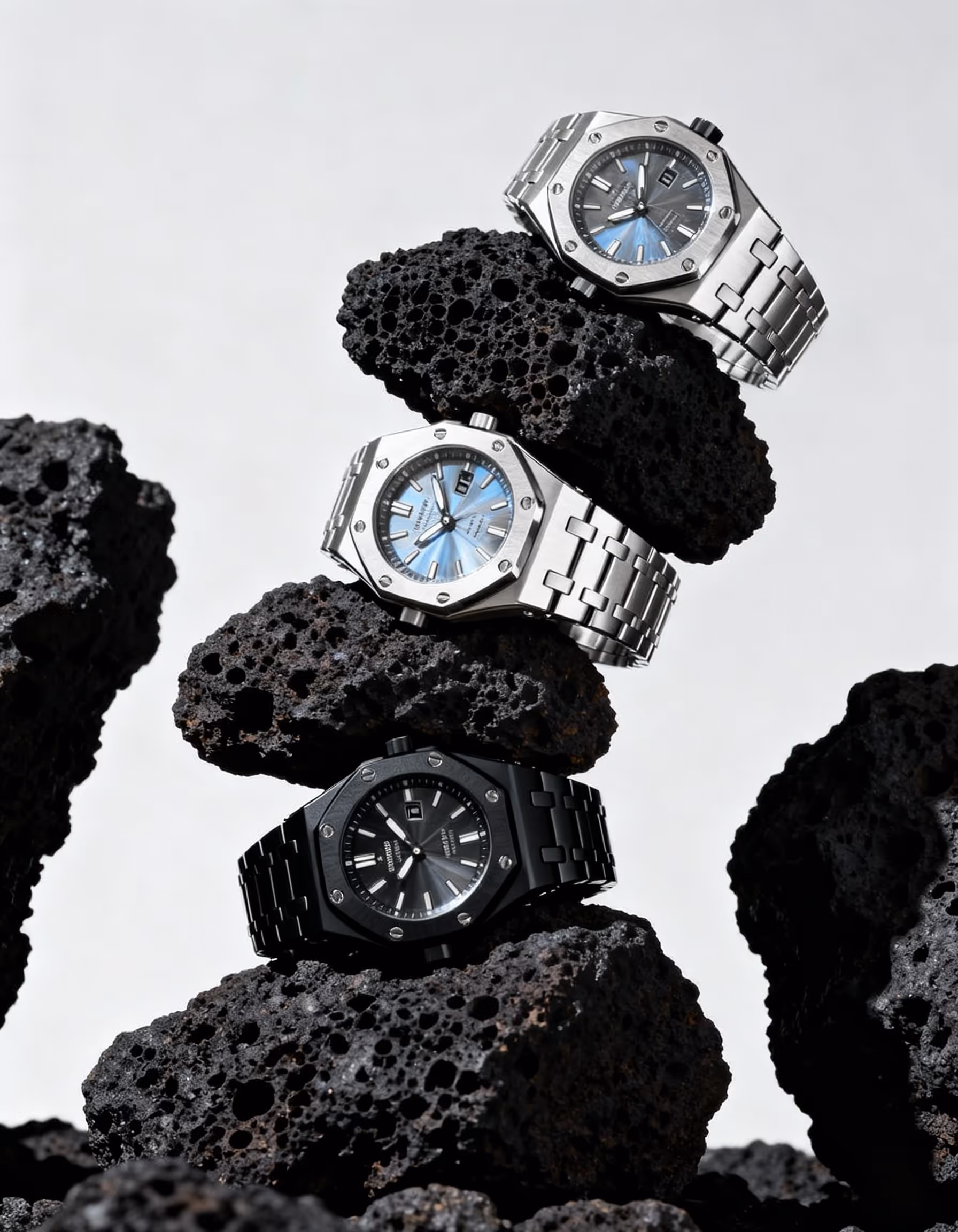 Three black and silver sport watches stacked on volcanic rock. Texture and contrast. Grey almost white background.